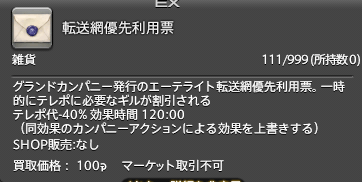 - 効果: 2時間、テレポ代40%割引(FCアクションのテレポ割引IIIと同じ効果)