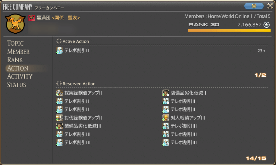 フリーカンパニー(FC)メンバーだけが効果を受けられるアクションです。FCが同時に使えるアクションは2種類までという制限があるため、利用できるかはFCの方針次第となります。