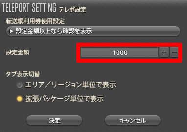 - 設定方法: テレポメニューの**「テレポ設定(歯車のマーク)」** → 「転送網利用券の使用設定」に設定金額を指定する