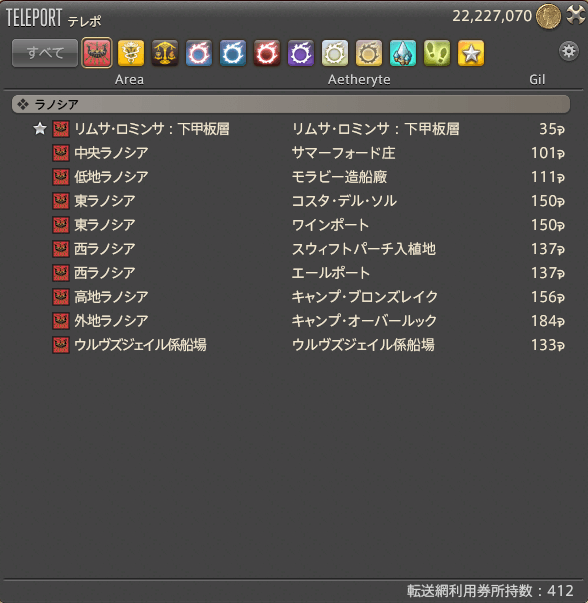 同じエリアへの移動は、100ギルかかるので30%割引されて70ギルです。リムサ・ロミンサからリムサ・ロミンサへのテレポ代はお気に入り登録することでさらに半額になり、35ギルになっています。